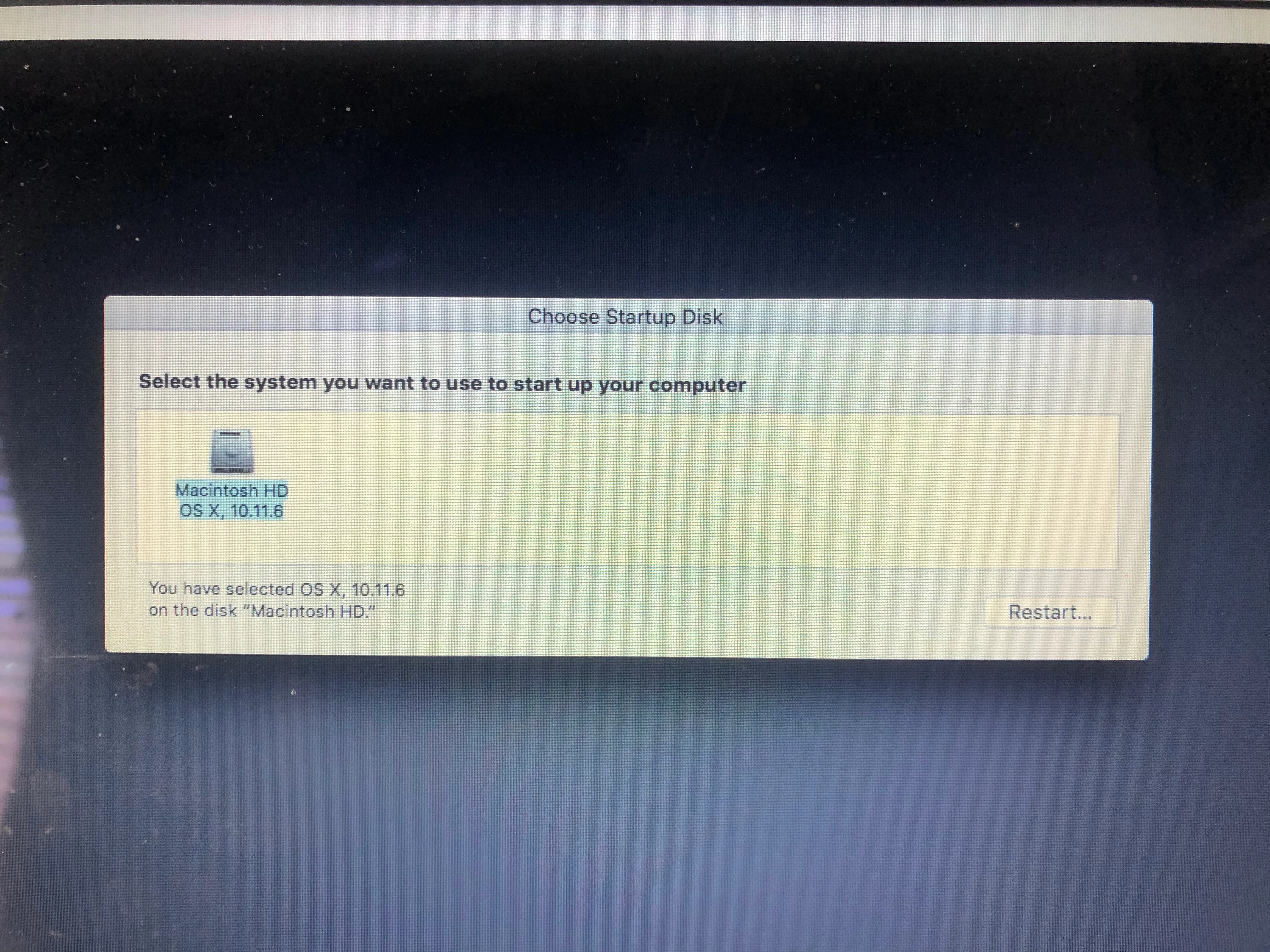- When in this mode, I do finally see the Macintosh HD in the Startup Disk. (See screenshot). It's showing that OS X 10.11.6 is there and I supposedly can boot to it.