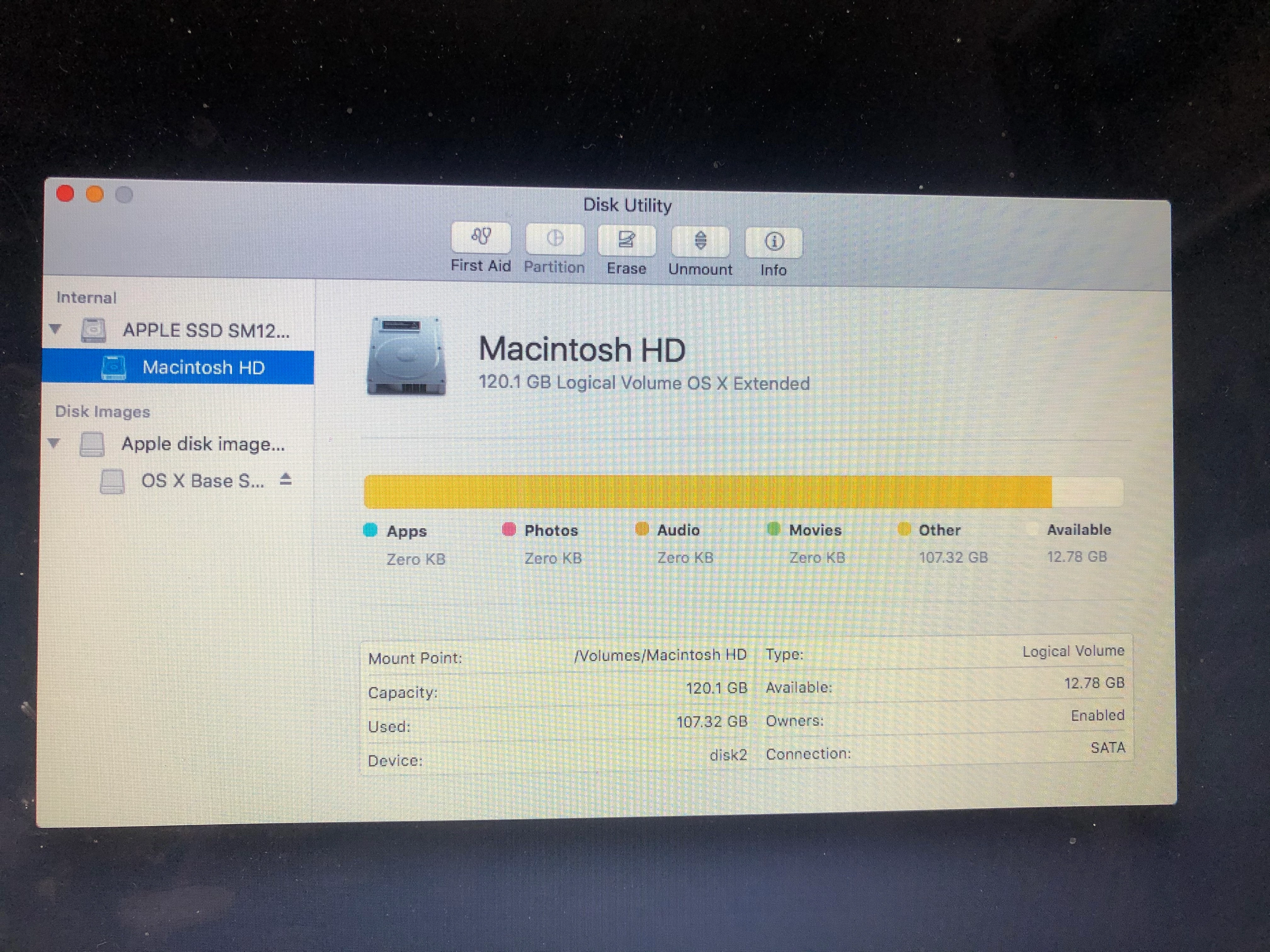 - I boot into Recovery mode (Command+R) and In Disk Utilities, the drive looks fine. (See screenshot)