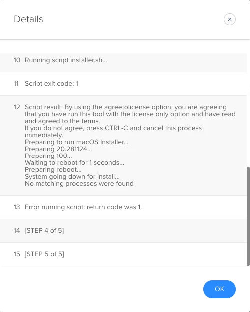 I have some issues going on regarding this script thats pushing out our High Sierra OS upgrades via Self Service. The OS updates perfectly fine on the user side. No issues reported during our testing pushout, but it shows up as "failed" in the policy logs.