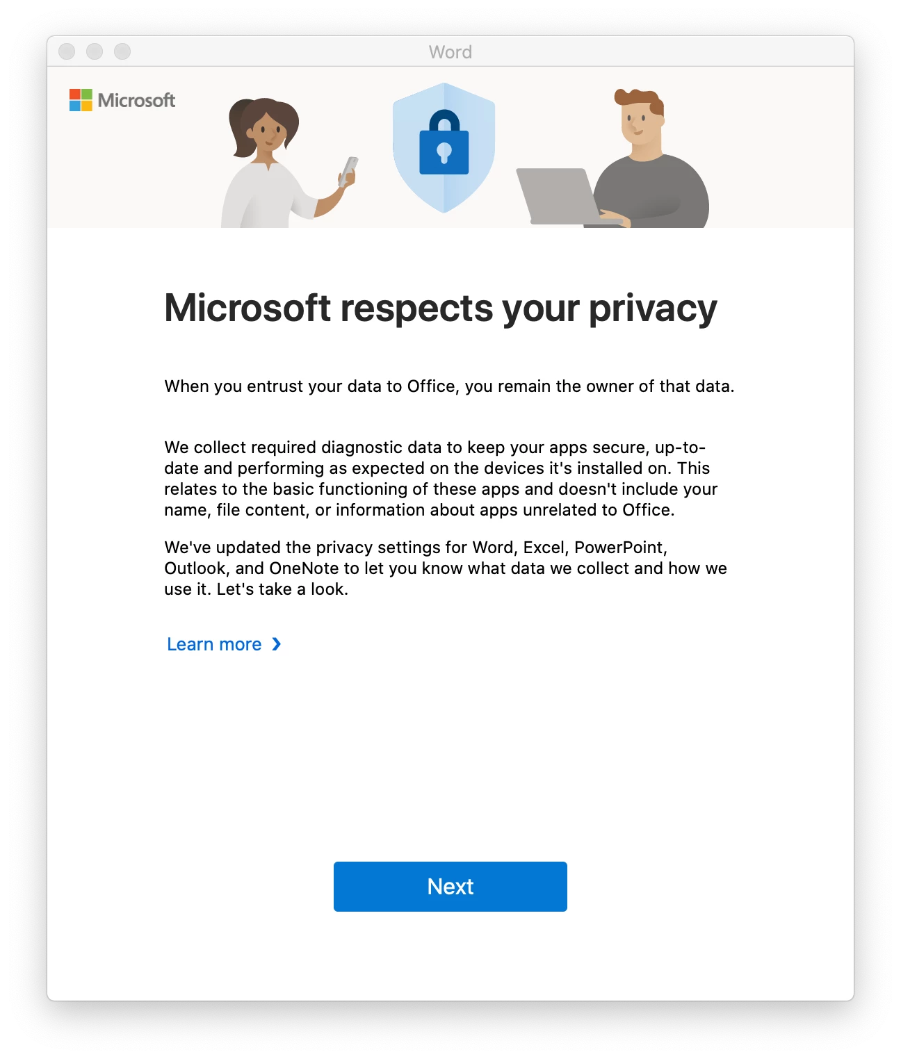 How to Suppress "Microsoft respects your privacy" Popup in Office. This is on all apps.