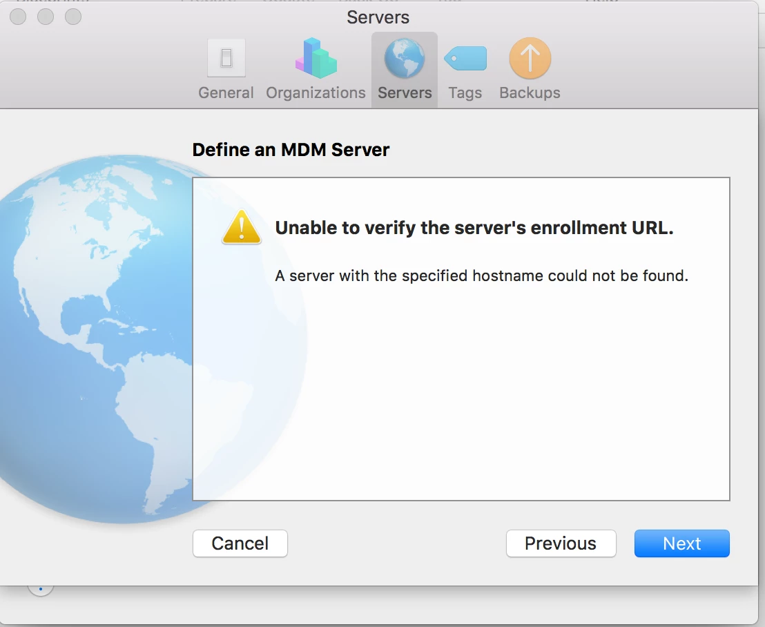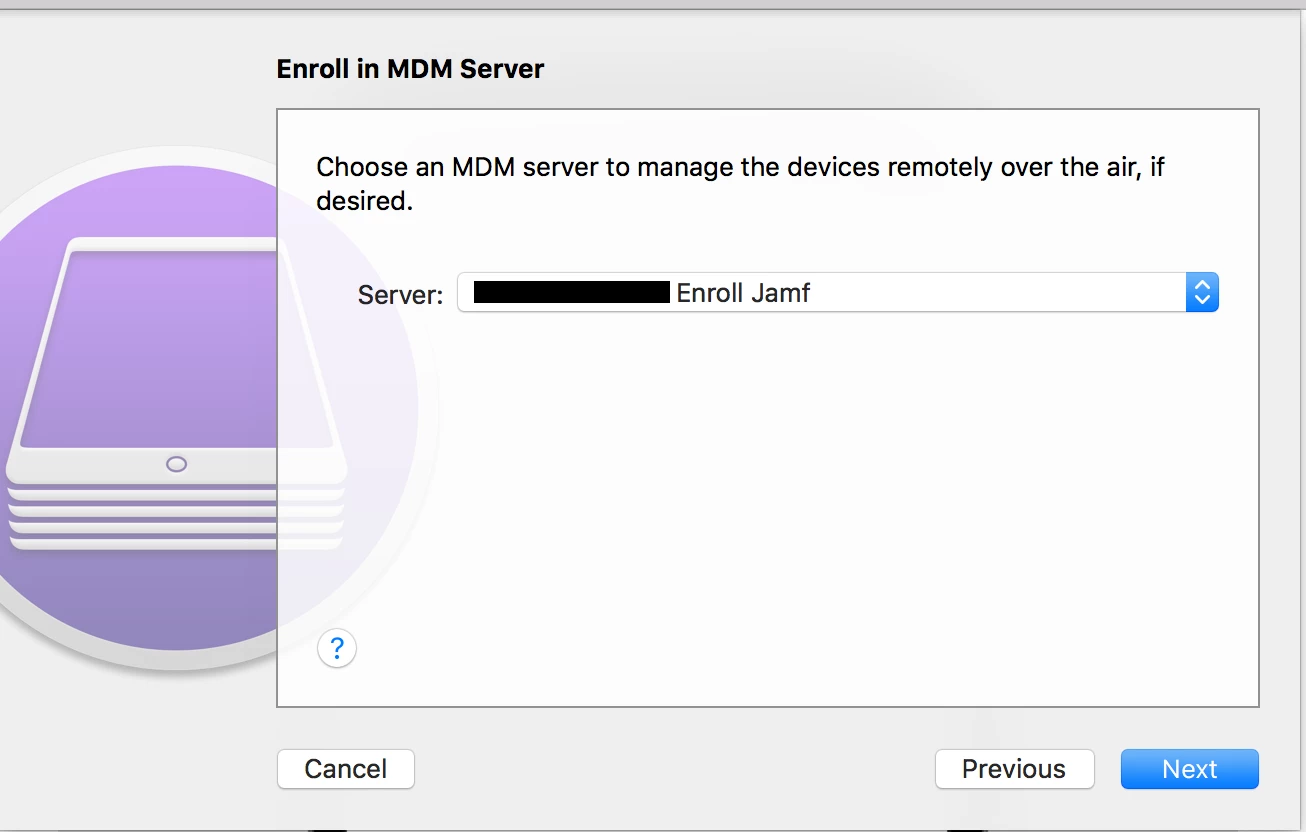 7.) When asks for the server URL according to Jamf documentation: If you are enrolling via the static URL, enter the static Apple Configurator enrollment URL for the JSS. The static Apple Configurator enrollment URL for the JSS is the URL for the JSS followed by “ /configuratorenroll”. For example, "https://jss.mycompany.com:8443/configuratorenroll".