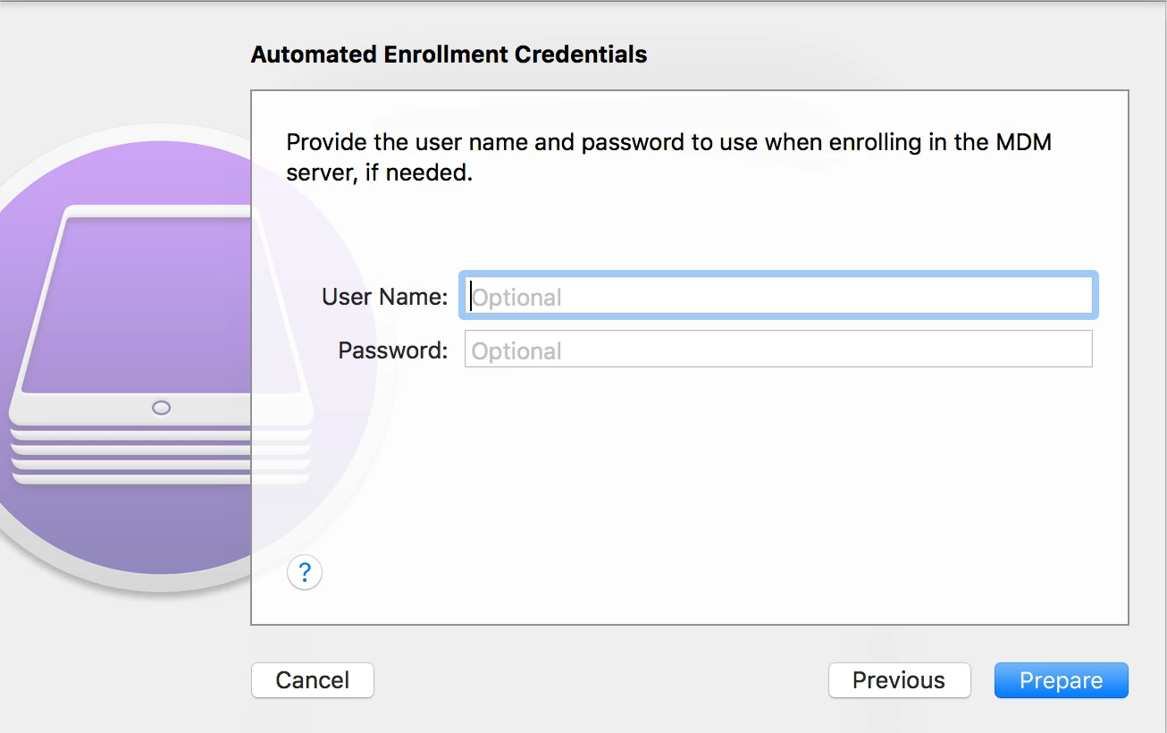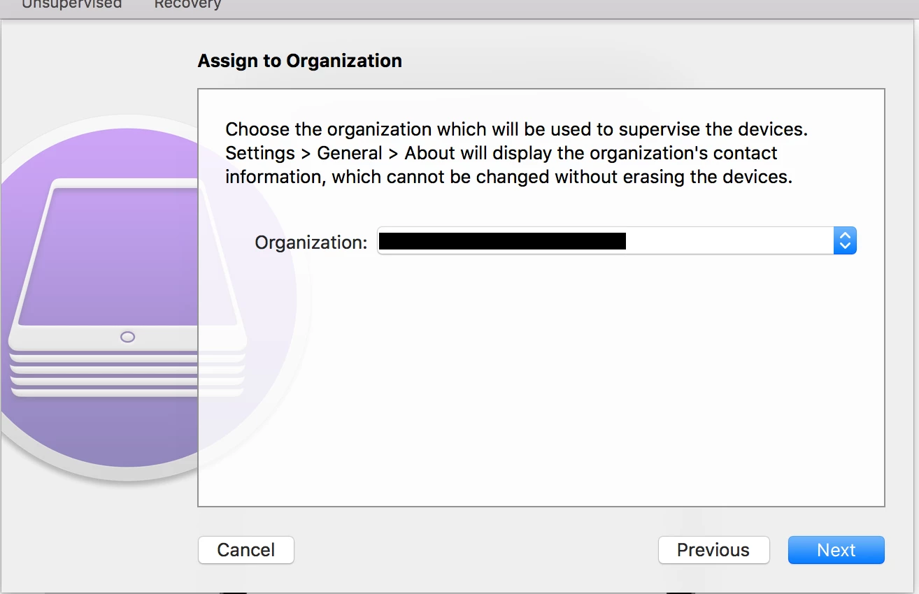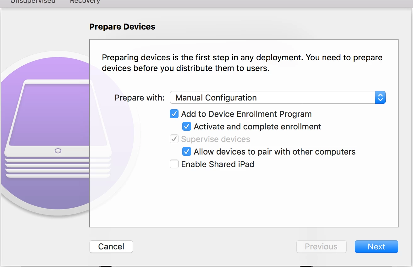 Choose to "PREPARE" from the top. Choose the desired Settings. I choose to enroll the device in the DEP, and Supervise it.