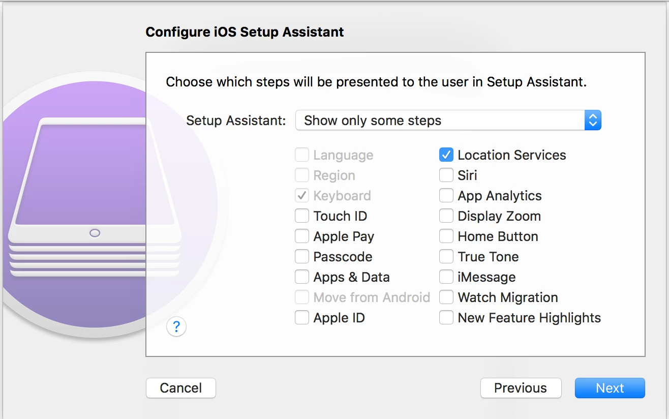 13.) Set your iOS Setup Assistant items you want to show at startup. I always leave location settings on So I can select it which will work with Find My Device on iCloud.