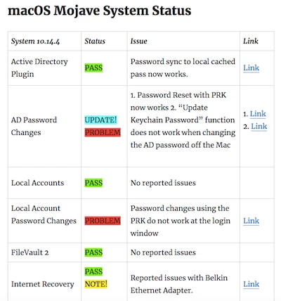 Hey Guys, I was thinking about this idea for a while now. I wanted to create a "macOS System Status" page. This page would be for OS items that are working/not working in the latest version. This would closely match the idea of Apple's Service Status page where it show you if DEP was down. You can understand the frustration, if you have ever worked for hours troubleshooting an issue only to find out the problem was a known issue. Hopefully this page will help! I will keep track of major issues that could cause problems in your workflow or generate help desk tickets.