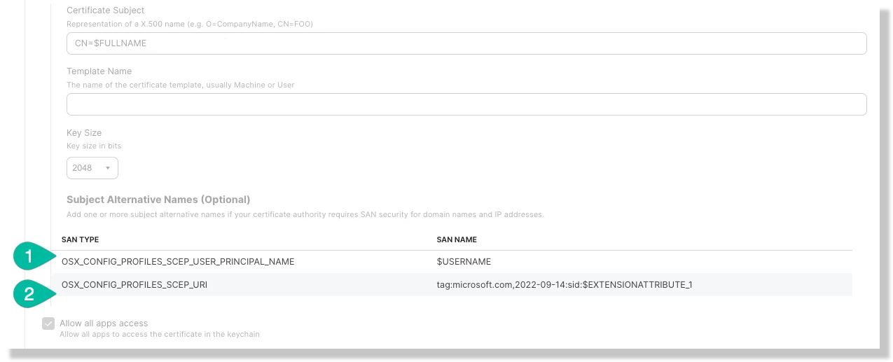 For strong certificate mapping, can two SAN types be used in the Subject Alternative Names field? Official guidance specifies using only the SCEP URI, and although the current configuration with multiple SAN types appears to work, it seems unreliable, as I’m seeing additional certificate-selection prompts. This change was made while I was out, so I need to confirm that this approach follows best practice.
