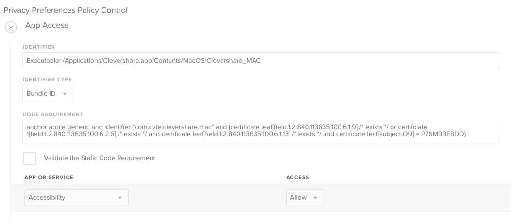 I'm trying to get to grips with my first config profile to pre-approve an accessibility permission to one app used across our organisation but hitting the buffers somewhat.