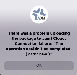 There was a problem uploading the package to Jamf Cloud. Connection failure: "The operation couldn't be completed. (error 504.)"