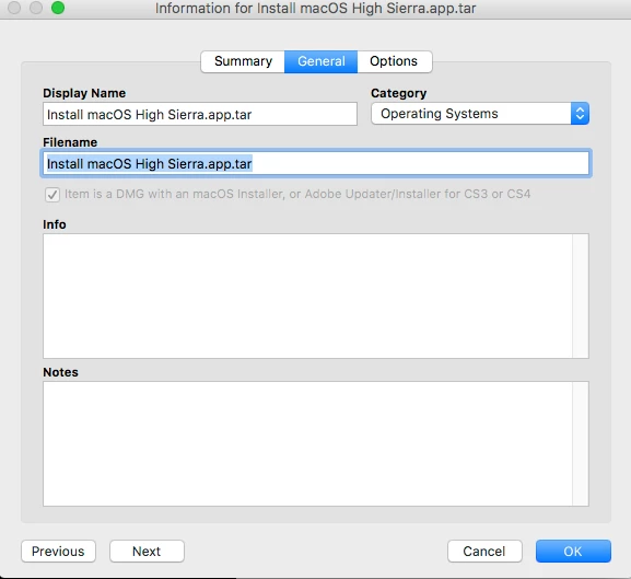 When i upload the "Install macOS High Sierra.app" into Casper Admin the display name & file name being created is Install macOS High Sierra.app.tar