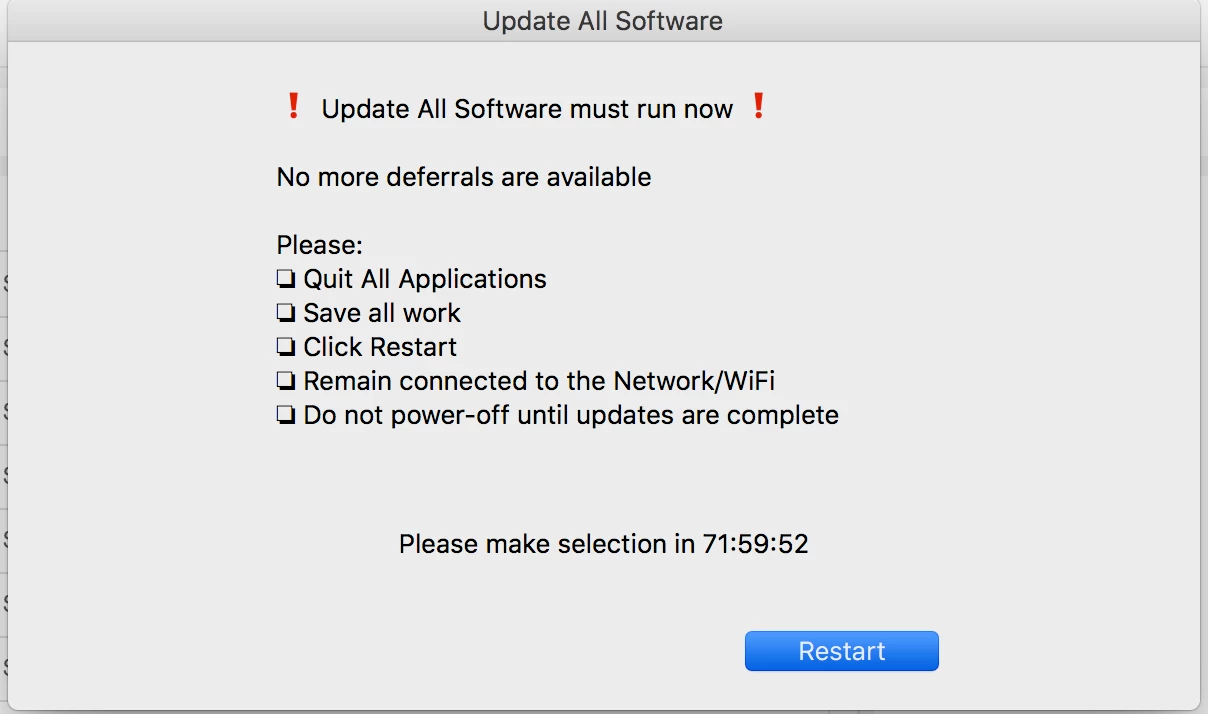 Hi, I'm using a MacBook Pro 13 retina with OS ver. 10.13.6. Since some days, sometimes (Often) appear a small windows that suggest me to ! Update alla software must run now ! with only a button "Restart" and a countdown timer on 72 hours. I've seen into the processes it seems a Jamf Helper process. If a push the button nothing happens.
