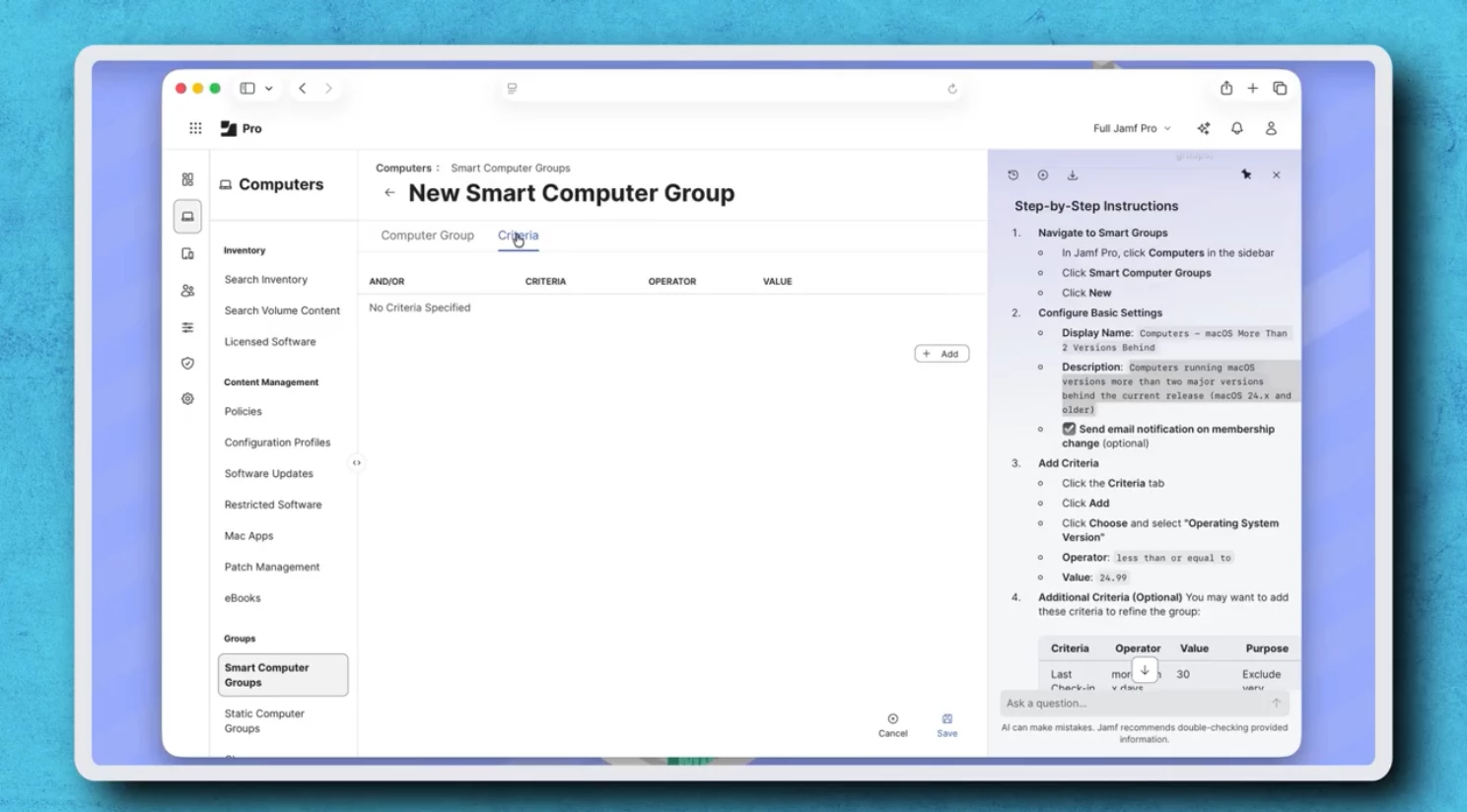 While watching Jamf’s new AI assistant demo, I noticed the assistant confidently instructs the user to create a Smart Group using an OS version value of 24.99. macOS 24 doesn’t exist, Apple jumped from macOS 15 to macOS 26. The presenter follows the incorrect instructions exactly and saves the group. For an official Jamf-produced video meant to showcase the accuracy of their AI, this is a pretty embarrassing oversight. Curious if others caught this too.