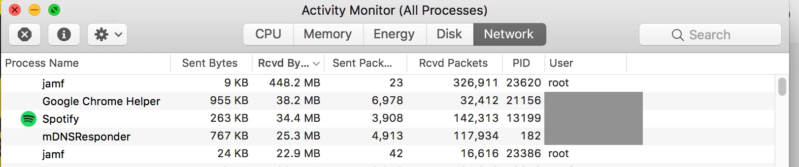I never know jamf was installed on my computer until a few days ago there was a sudden surge in my network data usage. I noticed that this 'jamf' app has been suddenly taking up several hundred mb of data of a few seconds, then disappear for a while, and will come back again and repeat. It has never happened before. Does anything have similar experience, and if so how did you resolve that? The attached image in an example of what happened.