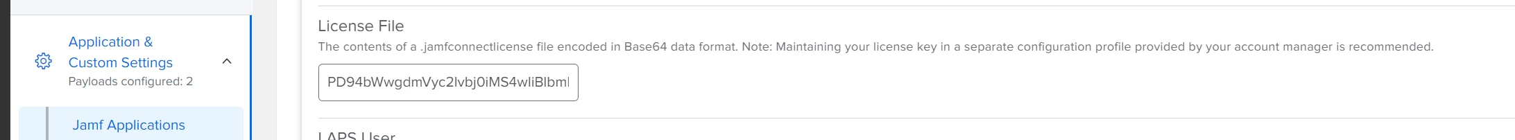 I Copied a Base64 encoded license string from Jamf Account, and then paste it into the License File (LicenseFile) setting of a Jamf Connect configuration profile.