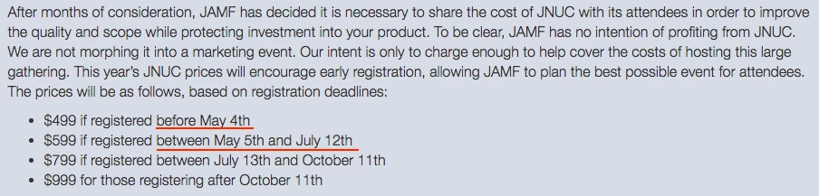 After months of consideration, JAMF has decided it is necessary to share the cost of JNUC with its attendees in order to improve the quality and scope while protecting investment into your product. To be clear, JAMF has no intention of profiting from JNUC. We are not morphing it into a marketing event. Our intent is only to charge enough to help cover the costs of hosting this large gathering. This year’s JNUC prices will encourage early registration, allowing JAMF to plan the best possible event for attendees. The prices will be as follows, based on registration deadlines: