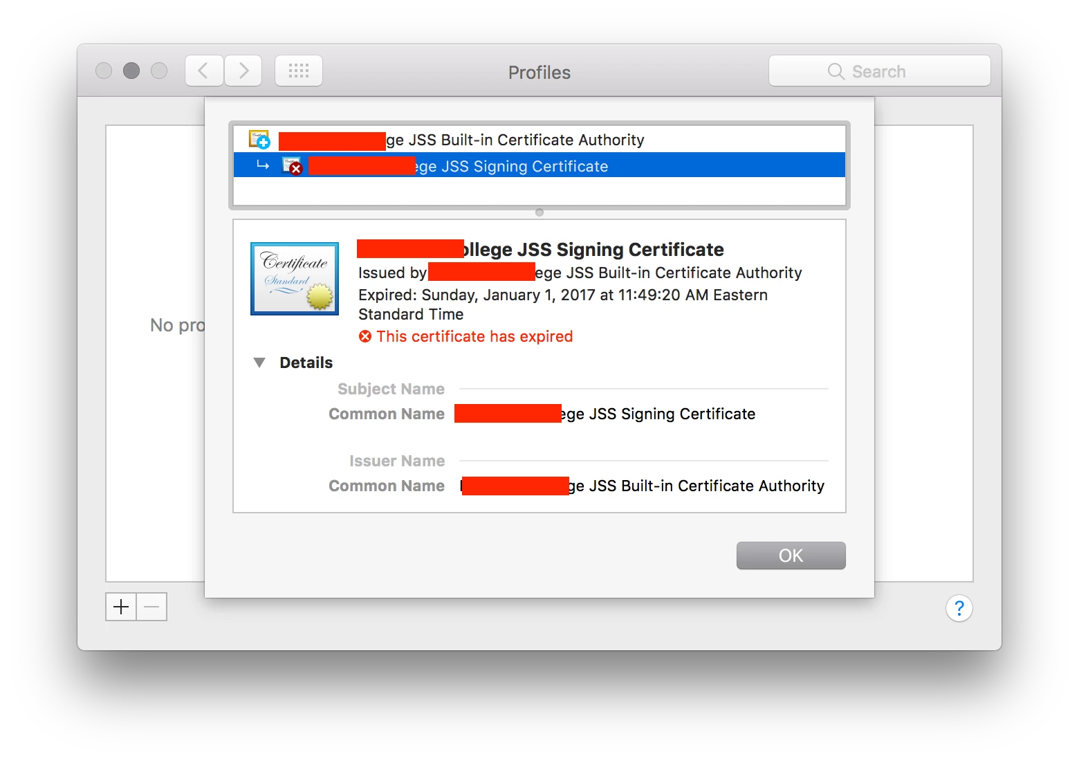 But, when I look at the MDM profile on the client machine, it's unverified because the "JSS Root certificate authority" is valid until 2021, but the JSS Signing Certificate says it expired on January 1st of this year.