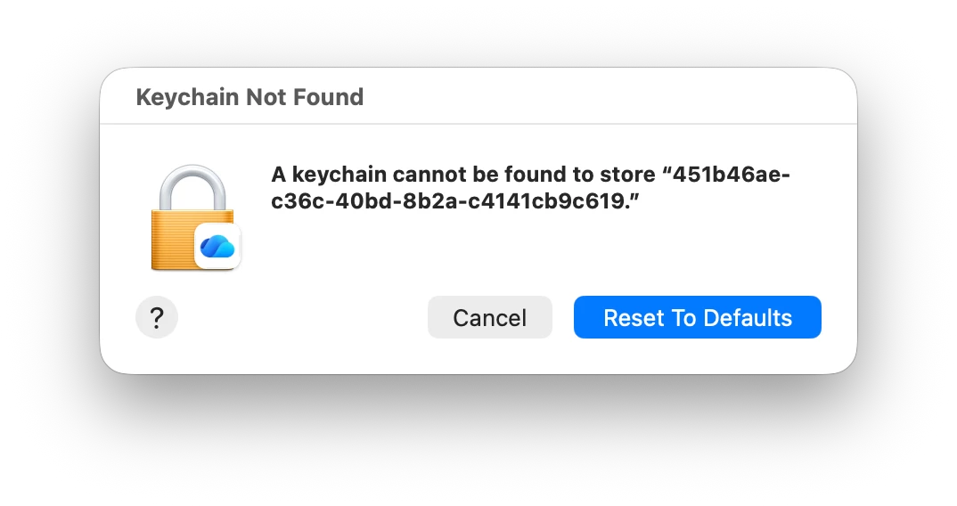 I am seeing a Keychain not found alert after I recently started enforcing OneDrive Desktop and Documents sync. This just happened on my newly enrolled test Mac after I registered platform single sign-on. The alert appeared as I was logging in to OneDrive. There is actually an entry in Keychain. I looked up the ID shown in the screenshot. Reset to Defaults is NOT the right choice. I found that unlinking the Mac from OneDrive and then signing in again helps, but this prompt came up as I was in the process of logging in. We use platform single sign-on so there is no password prompt. Has anyone else seen this and solved it?