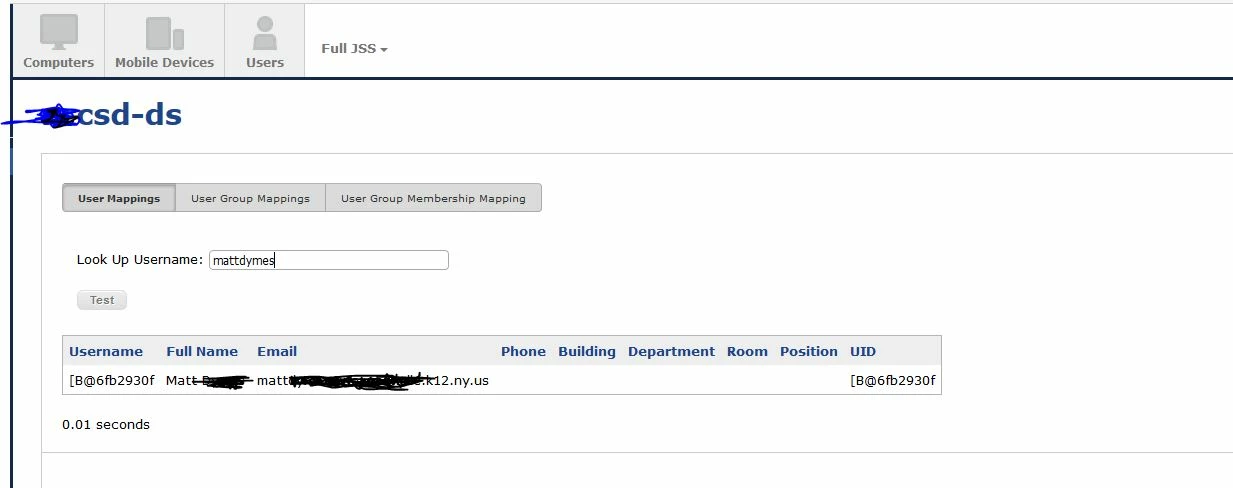 Hi, I am trying to troubleshoot my Casper LDAP Connection. The JSS server is v9.98 running on a Windows Server 2012 R2. I have an ldap server setup, and it does not fully work. The issue is, I cannot return and value that identifies username or uuid. What returns is a random ascii string. I can point this at the cn or UID ldap attribute and the same happens. Looks like the jamf wioll not properly return the UID or CN attribute no matter what field I put them in (Phone or room fields as well). Other attributes like fullName or mail return fine. The ldap server is Novell eDirectory, I have tried with a manual configuration as well. With Apache Studio, all fields are read without a problem (UID and CN appear as they should).