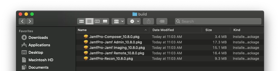 If you don't change anything your apps will be packaged in /private/tmp/jamfpro/build directory (which opens up after the script runs). This process takes less than a minute to create a package for each Jamf app you have installed in the /Applications/Jamf Pro/ directory.