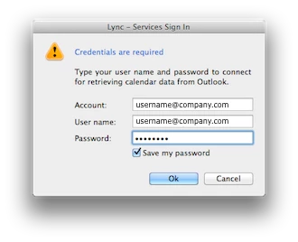 The Lync 2011 for Mac 14.0.10 update is causing an issue for some people where it will always bring up a second login prompt. To prevent it from prompting for login credentials a second time you must login at the main window using username@company.com in the User ID field. See the screenshot below.If you sign in at the main window with just your username in the User ID field it will login to Lync successfully, but it will fail to connect to your Exchange Calendar and prompt for credentials a second time. The second login prompt will only accept username@company.com in the Username field.