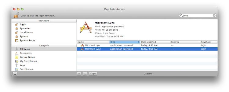 If you just use your username at the second prompt it will fail and repeatedly display this prompt. To further confuse the matter this second login window has "Save my password" checked by default so if you attempt to login with just a username it will save the incorrect login credentials in your Keychain. Any future login attempts with the correct Username of username@company.com and "Save my password" checked may not properly replace the incorrect credentials already saved in the Keychain causing this second prompt to always display with the incorrect Username when opening Lync. If you have this issue this can be fixed by completely quitting out of Lync and deleting the saved credentials out of the Keychain. To do this open Keychain Access (located in /Applications/Utilities/), type Lync in the search field and delete ALL Microsoft Lync entries of the kind "application password".
