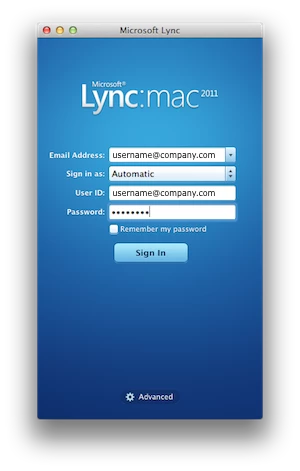 Once these entries are deleted open Lync again and sign in at the main window using username@company.com as the User ID and you will no longer get the second login prompt. If you check the "Remember my password" box here it will save the correct credentials to your Keychain.