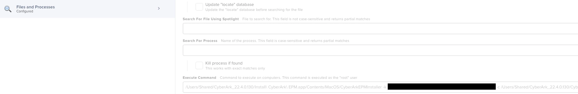 /Users/Shared/CyberArk_22.4.0.130/Install\\ CyberArk\\ EPM.app/Contents/MacOS/CyberArkEPMInstaller -k Put Your Installation Key Here -c /Users/Shared/CyberArk_22.4.0.130/CyberArkEPMAgentSetupMacos.config; sleep 20; rm -rf /Users/Shared/CyberArk_22.4.0.130/