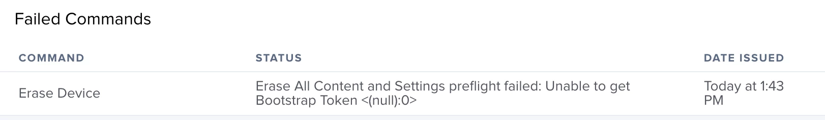 Erase All Content and Settings preflight failed: Unable to get Bootstrap Token <(null):0>