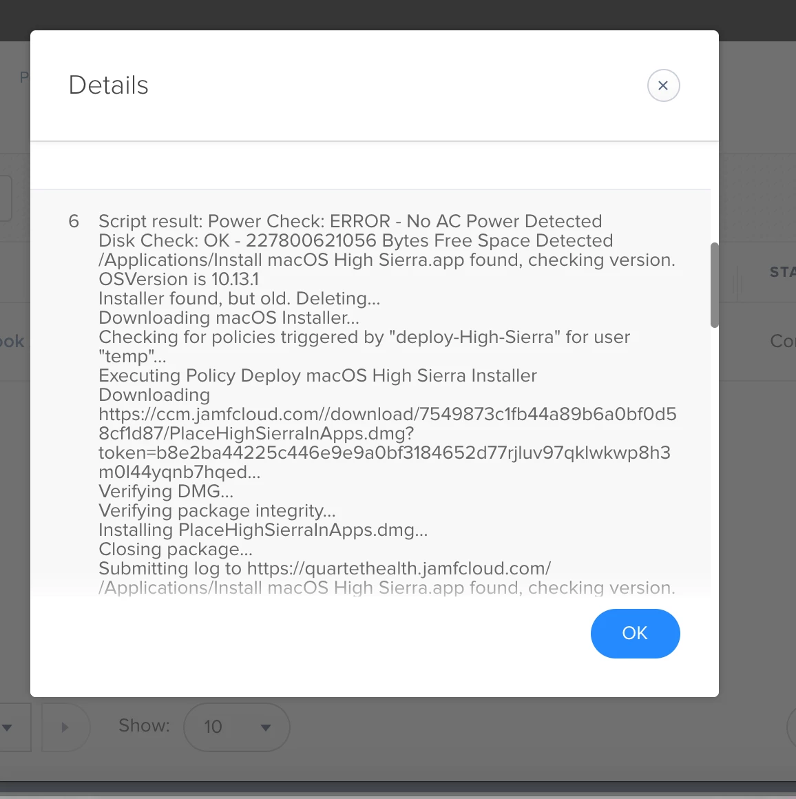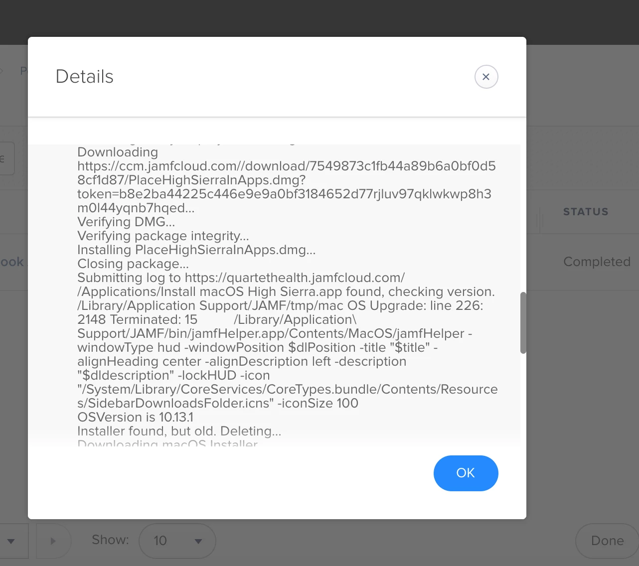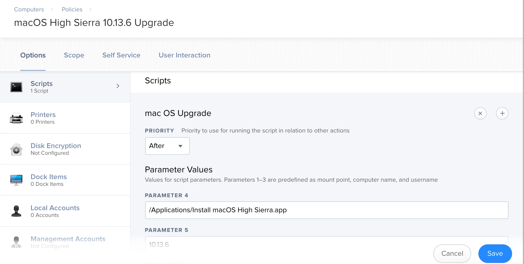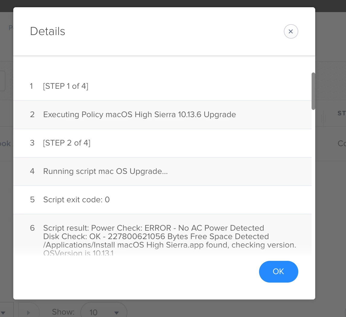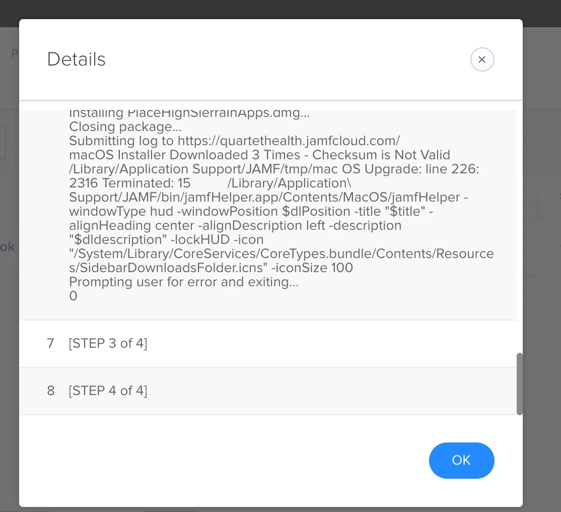@john.sherrod what could i be doing wrong?. My first policy puts the install high sierra.app in applications just fine. Am I supposed to change something in the policy that contains the script?