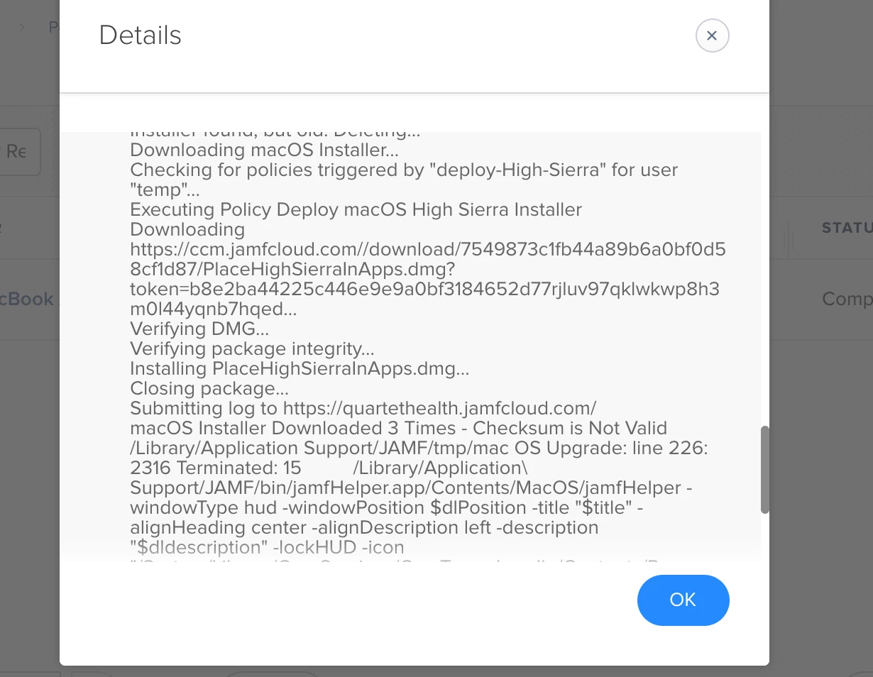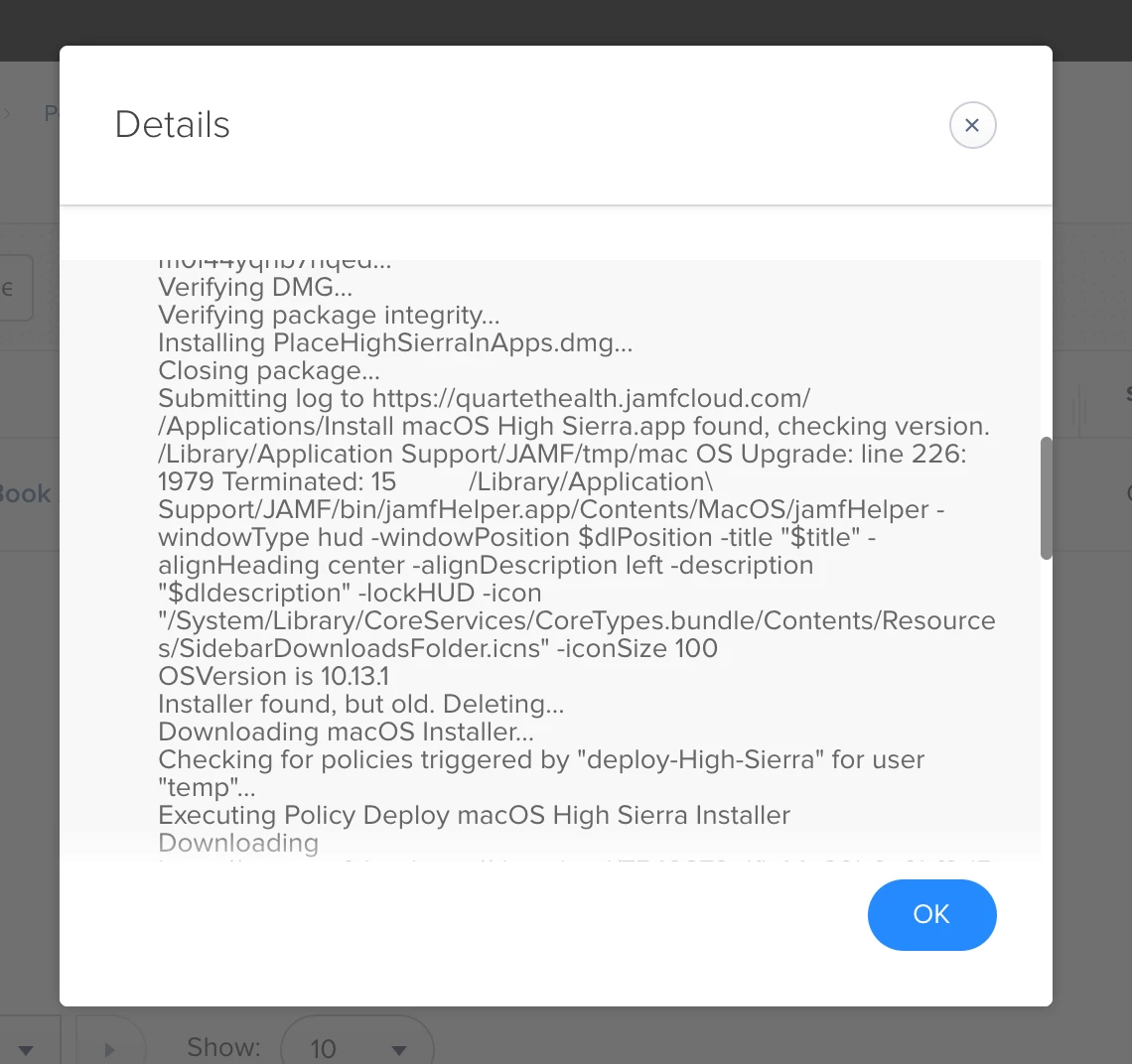Hi guys, I have been troubleshooting an issue for some time now. I have been trying to find ways to upload high sierra into jamf and push it out. Dragging the install file into jamf admin doesnt work. The file ends up getting converted to a tar. Half way through upload it just gets stuck uploading. I found a guide that mentioned using composer. Drag the high sierra.app file into applications and take a snapshot of it. Afterward, create a pkg/dmg and upload to jamf. I did this and it worked so far. The next step was to use a script that is supposed to upgrade the machines to high sierra. Here is the link to the script that i've found. https://github.com/kc9wwh/macOSUpgrade/blob/master/macOSUpgrade.sh. Does anyone have an easier way to do this?. Im unable to figure this out so far.