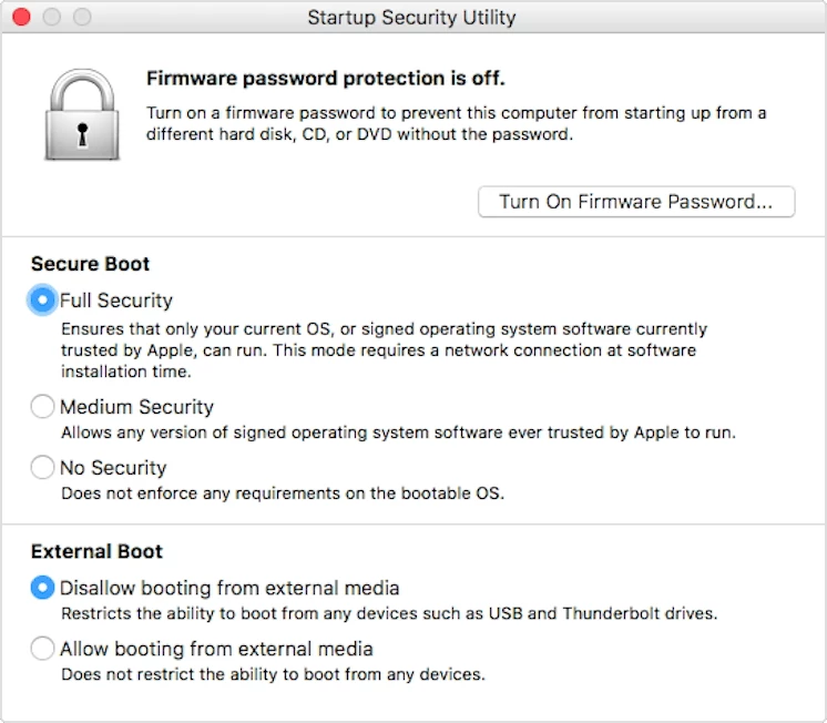 The work around, again as above, is to boot into recovery mode, then disable the T2 secure