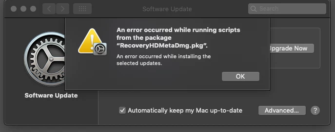 Just running upgrades on test computers for macOS Catalina and have had multiple errors as in the Screenshot.