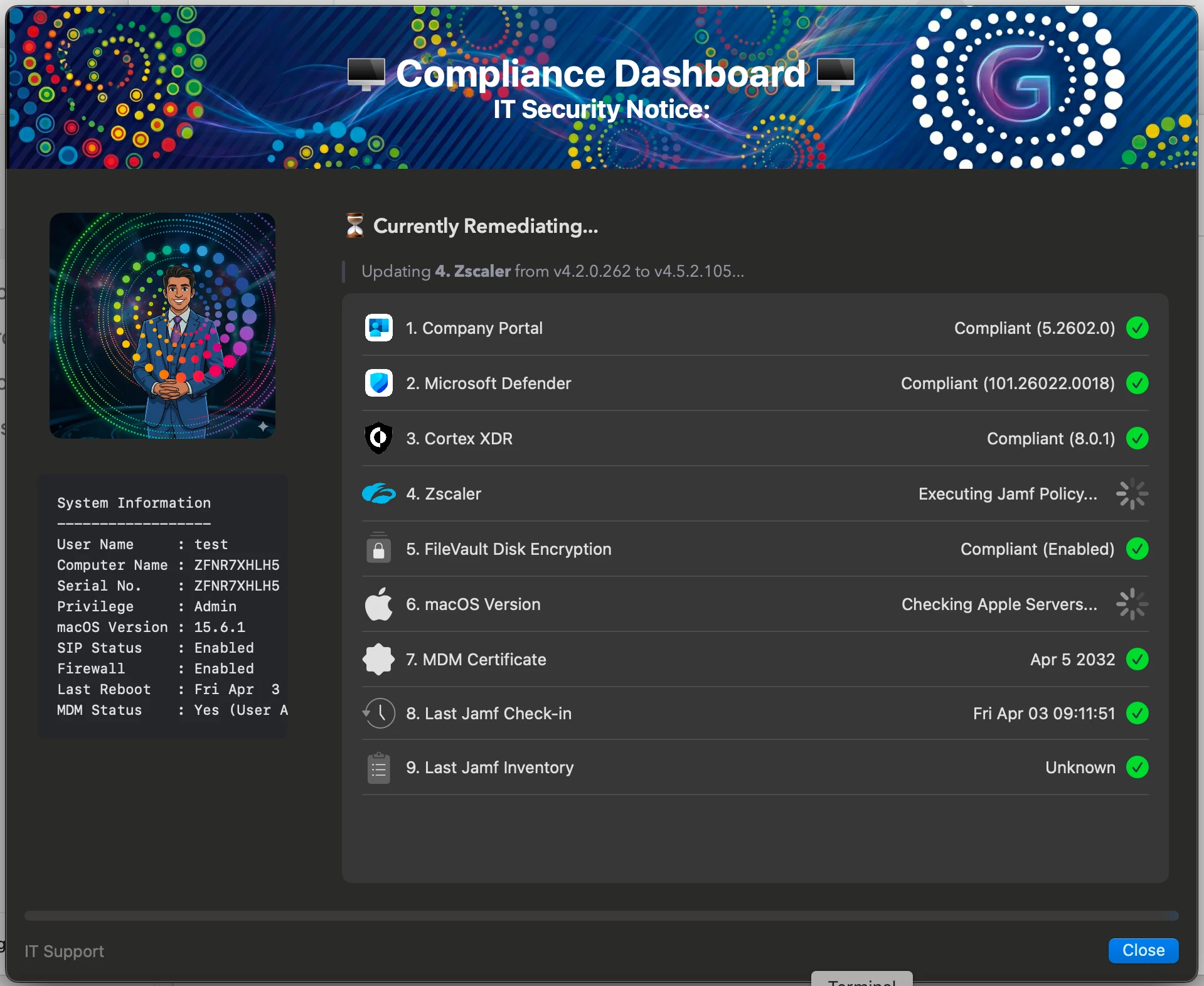 If any application is missing or outdated, remediation is automatically triggered via Jamf policies. The interactive dashboard provides live updates, clearly showing compliance status, ongoing fixes, and any required user action.