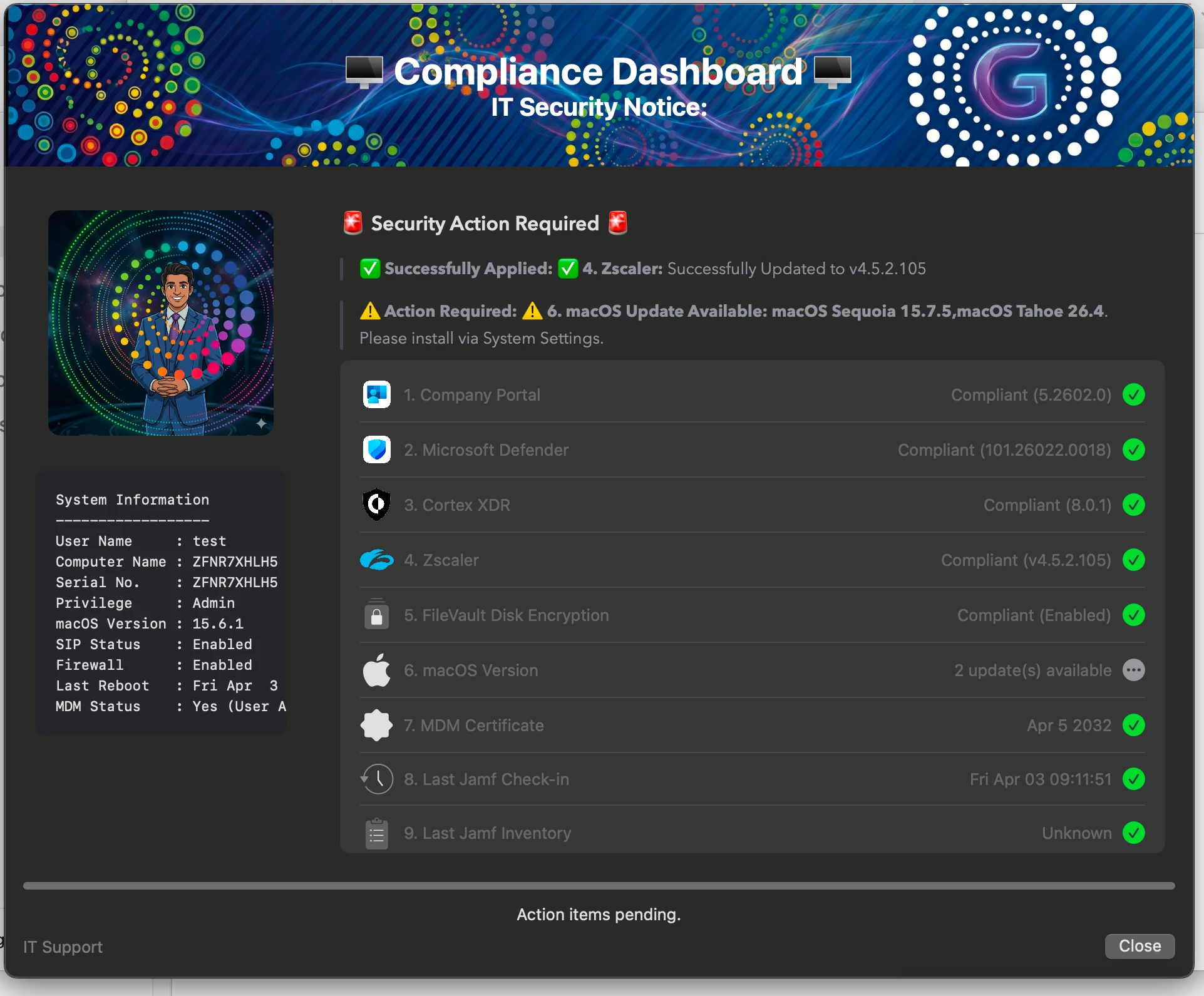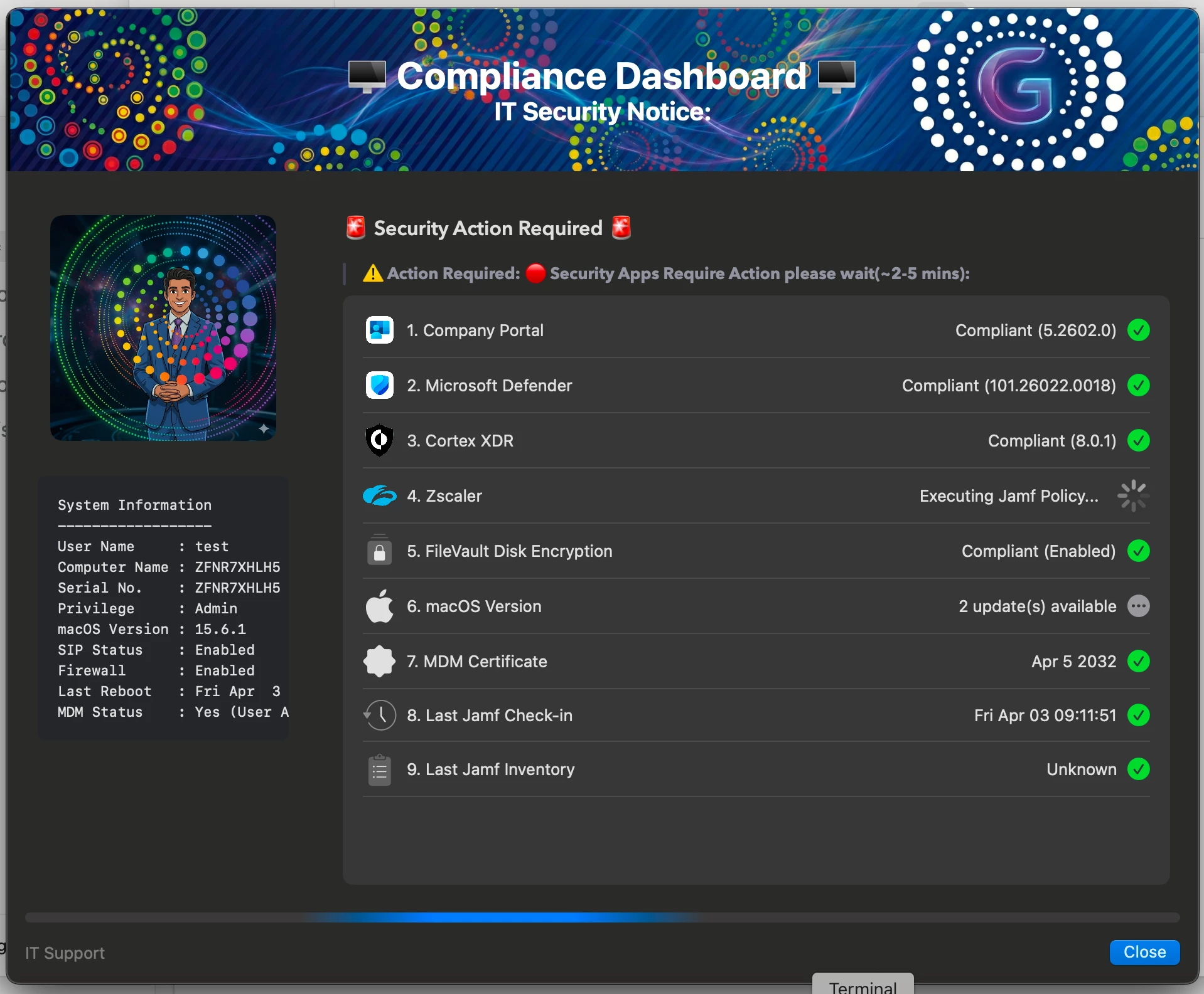 As part of improving endpoint security and reducing operational overhead, I built a macOS compliance dashboard using SwiftDialog and Jamf, available to users via Self Service.