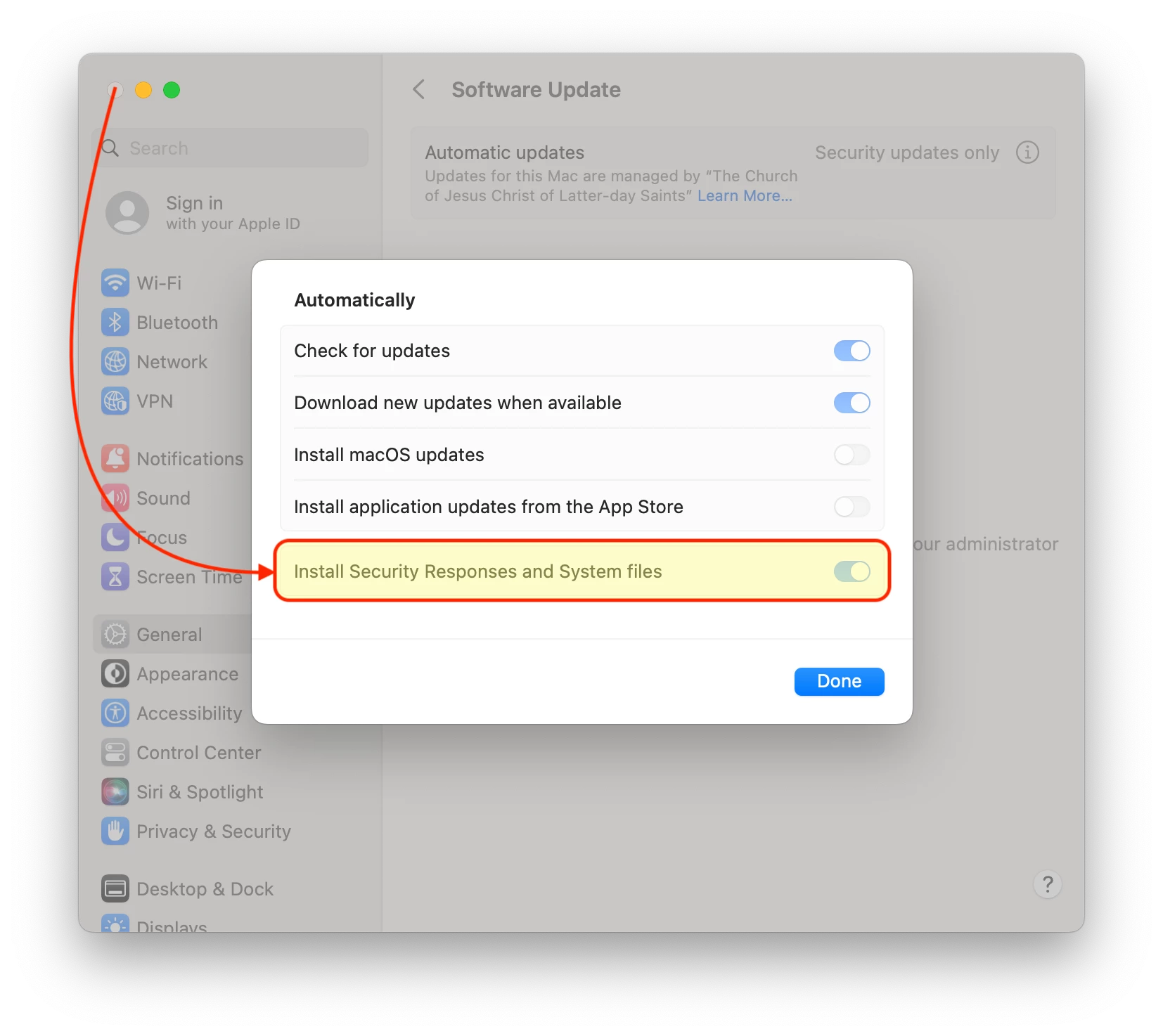 The domain/default pair of (/Library/Managed Preferences/com.apple.applicationaccess, allowRapidSecurityResponseInstallation) does not exist