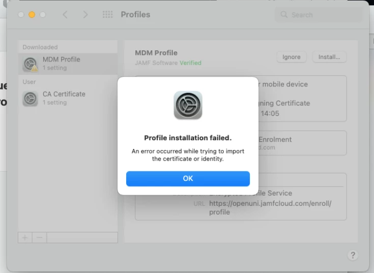 I've got someone with a 2015 iMac with Monterey 12.6 installed, trying to install MDM on it. We are able to download/install the CA profile but when trying to install the MDM profile it errors (profile installation failed an error occurred while trying to import the certificate or identity). It had been up for a fair few weeks and I thought a restart would fix it as it usually does but it didn't. It has Sophos installed, we disabled it and tried again but still no go. We updated to Montery 12.7.1 which I think is the highest it will go. Any ideas why it won't install?