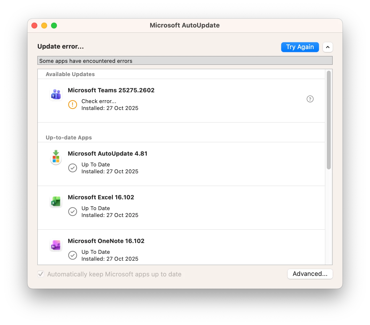 Microsoft AutoUpdate runs perfect for all Microsoft apps except Teams it always gives an “Update error” Removed it an install it again but the problem stays, any idea where to look?