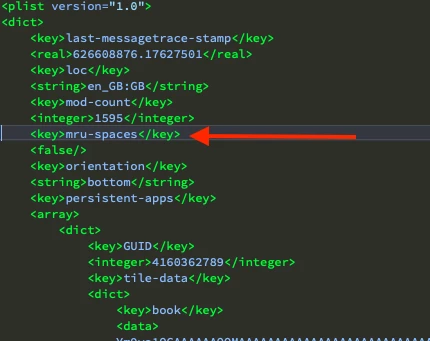 If we then look inside the file using BBEdit to see what is changing each time the mission control spaces option is clicked we see a setting near the top of the file called mru-spaces that keeps changing from true to false and back again each time the setting is changed.