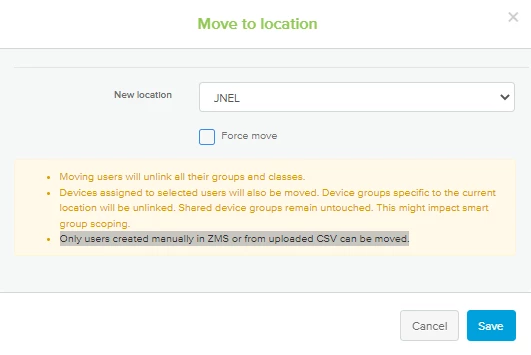 We use two locations within Jamf School to separate users and devices for our Middle and Lower Schools. It's time to move our rising 6th-grade users to the Middle School location. Devices do not move locations, only users. What is the easiest way to move users from one location to another? Any tips would be helpful!
