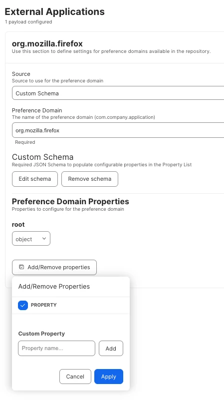 "description": "Complete Jamf JSON Schema for Firefox configuration including specific AI and PDF preference overrides.",