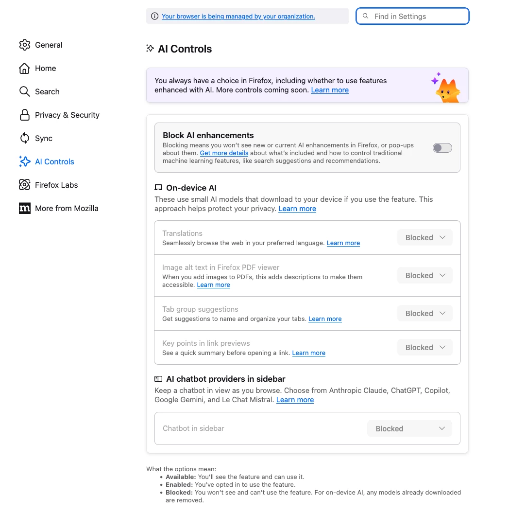 "title": "Firefox Enterprise Policies (Full with AI Preferences)",