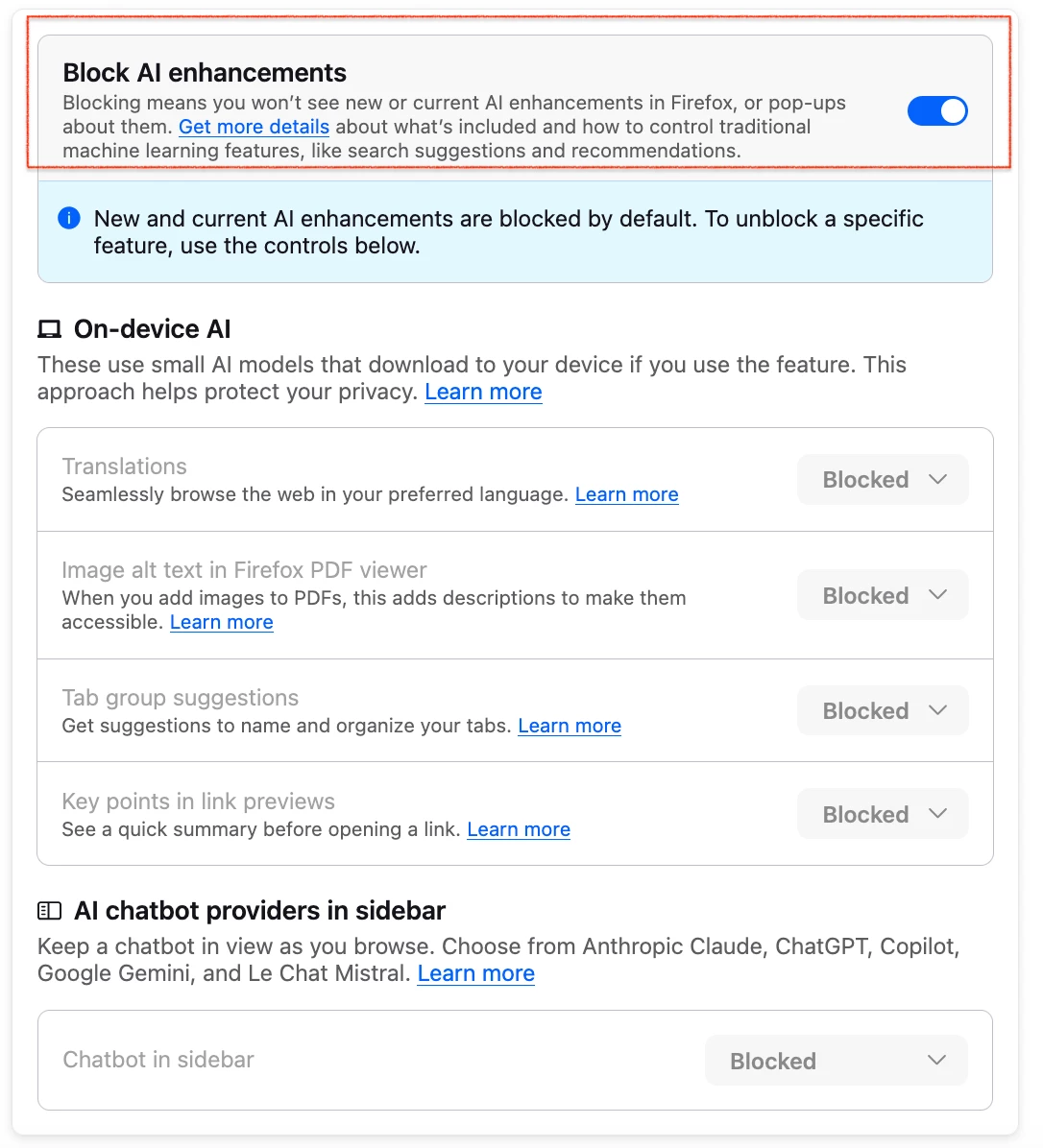 In order to block the AI components you need to set the following: