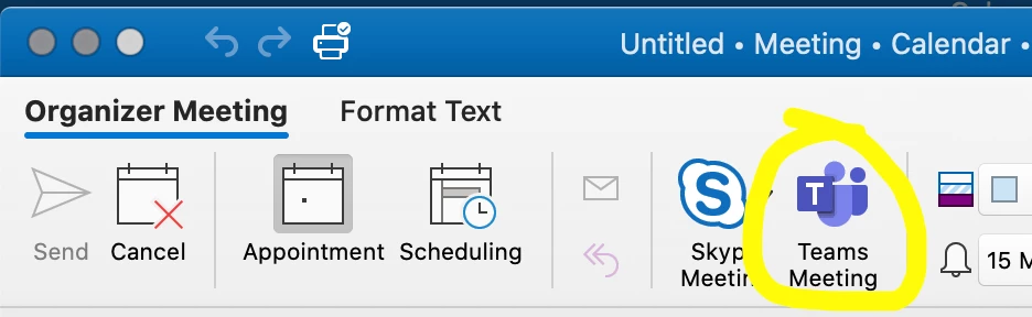 Mac with full Office, Outlook and Teams; both applications are set with same O365 account, everything work but there is no Teams icon in Outlook - Calendar- New Meeting.