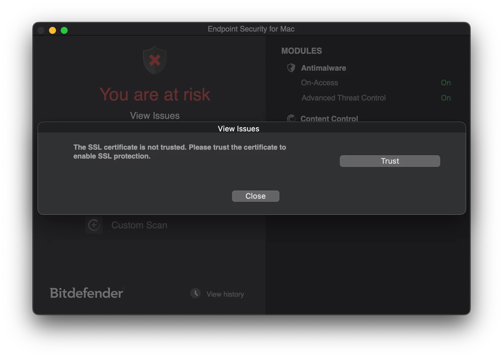 Note: I have been able to deploy the SSL cert without Bitdefender reporting errors, though it's not appearing in Keychain access so I am not sure if it's actually present on the machine.