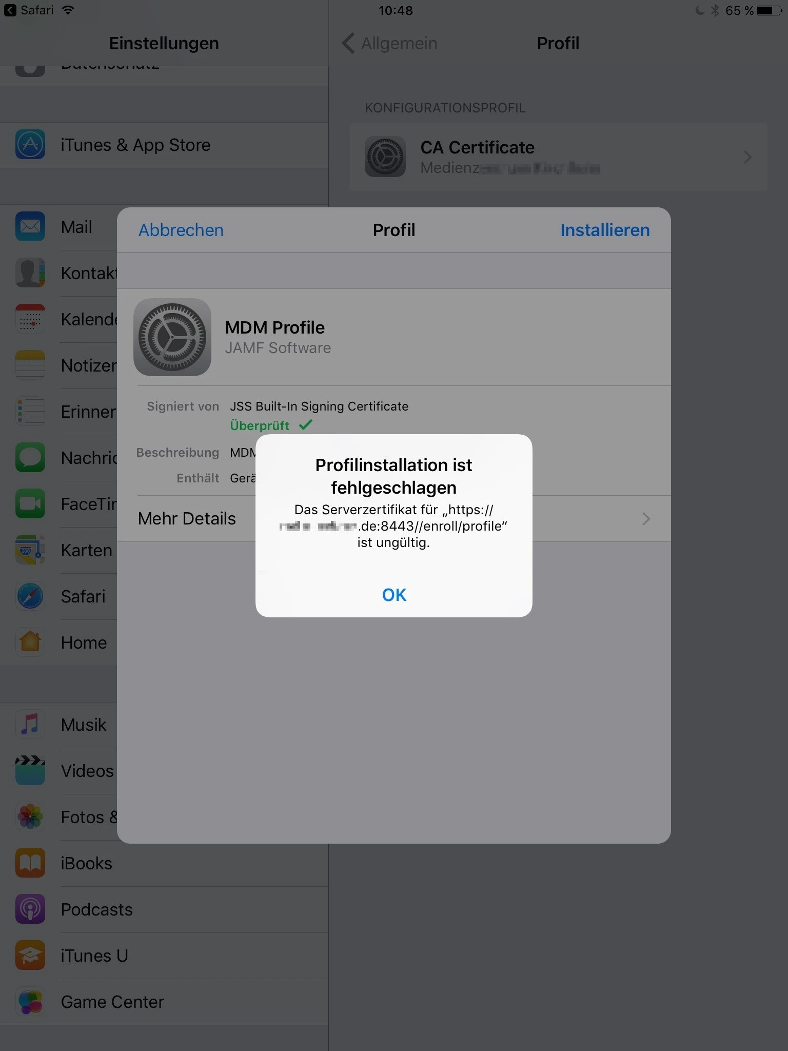 If your going through User Initiated Enrollment with built in CA created SSL cert and you don't back out of the enrollment process after installing the CA and go to Settings > General > About > Certificate Trust Settings and do the manual trust it will fail.