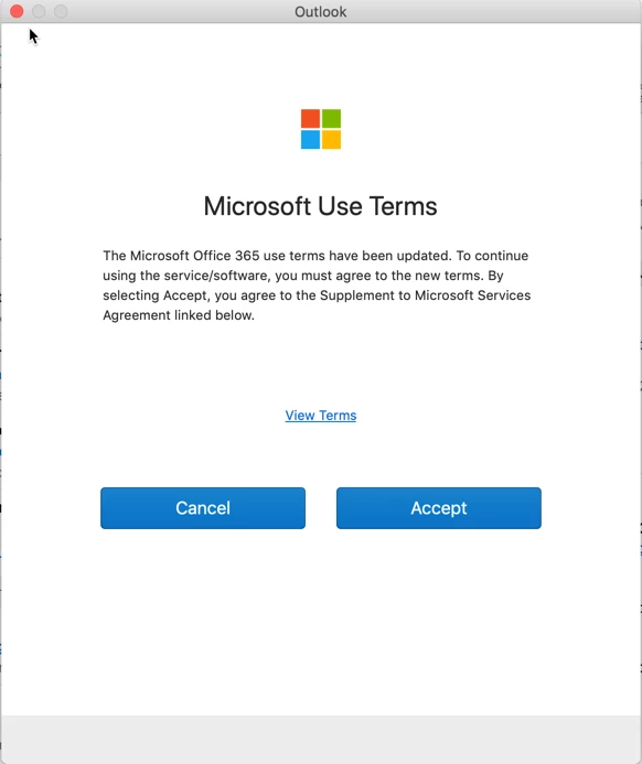 o365 Microsoft Terms Use pop up