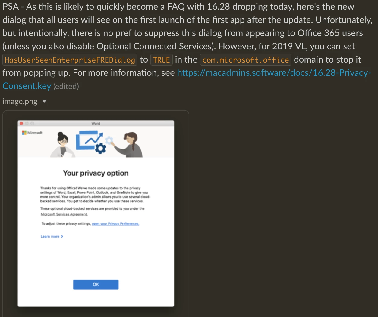Hi, I use a script to stop the Office 2016/2019/2021 first run popups but the only popup that still appears is the 'YOUR PRIVACY MATTERS'. What would i need to add to the script to not have this popup appear?