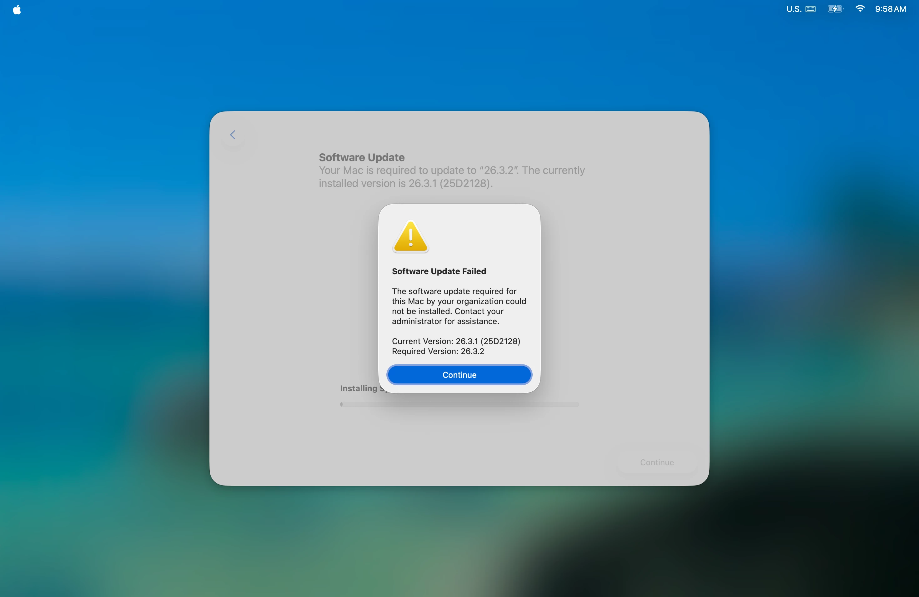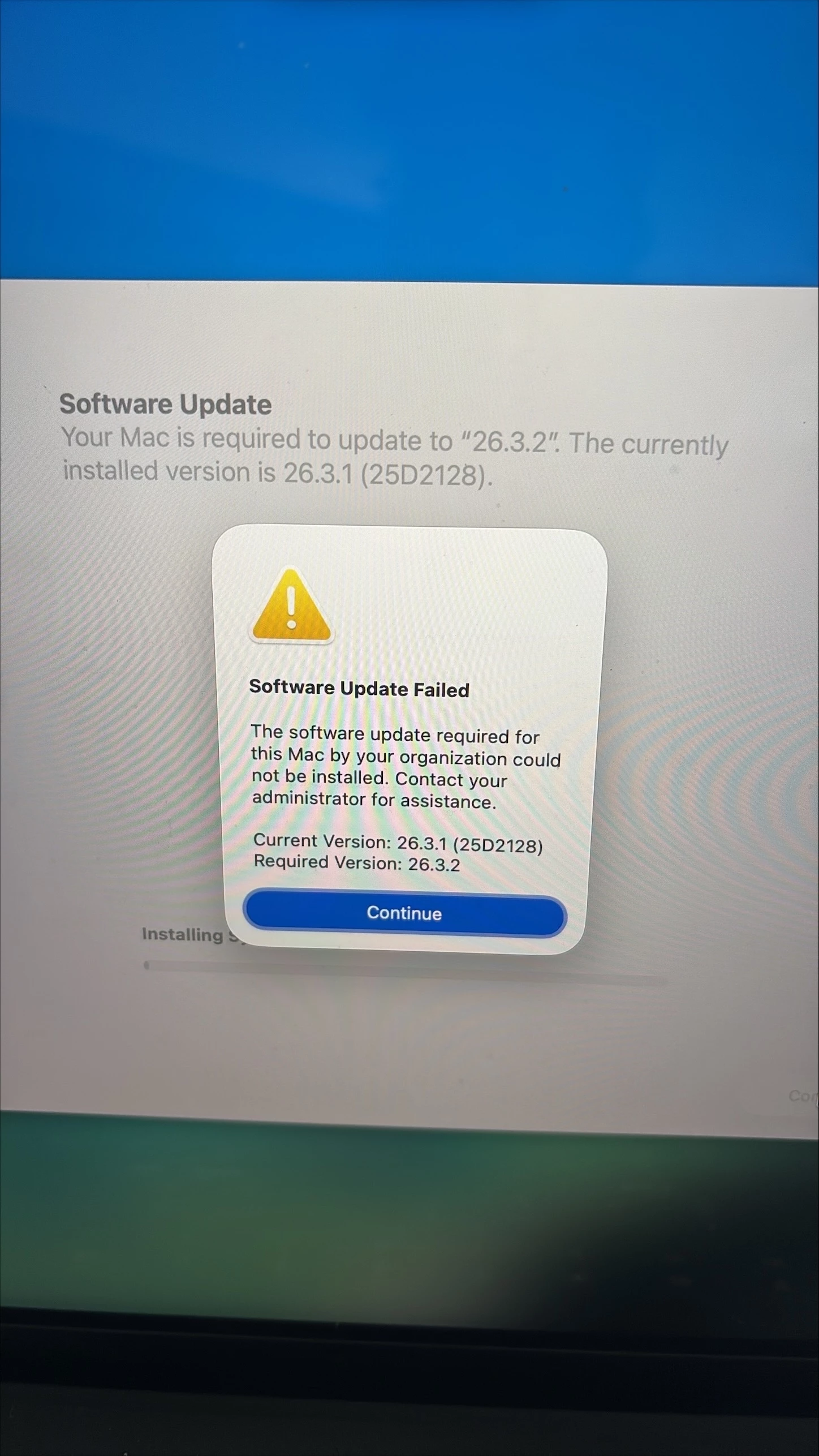 It seems the 26.3.2 update is trying to be installed on non-neo macs and it fails the process.