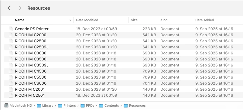 Hi @joboo72 thank you for confirming that it should work. I figured out that on my device but also in the pkg the ppd files are actually without file extension - so if I explore the path /Library/Printers/PPDs/Contents/Resources/ the filename is RICOH IM C3000 instead of RICOH IM C3000.ppd . The file without file extension cannot be uploaded to Jamf. So I have to modify the file.