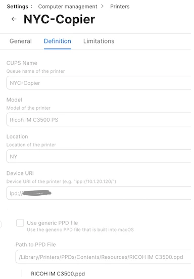 Hi @hmn. We recently added the same Ricoh and had success building the printer in Jamf Pro at Settings > Computer Management > Printers.