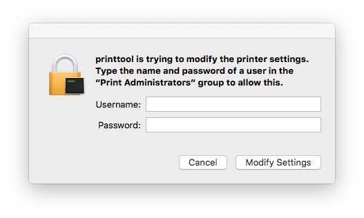 "Printtool is trying to modify the printer settings. Type the name and password of a user in the "Print Administrators" group to allow this."