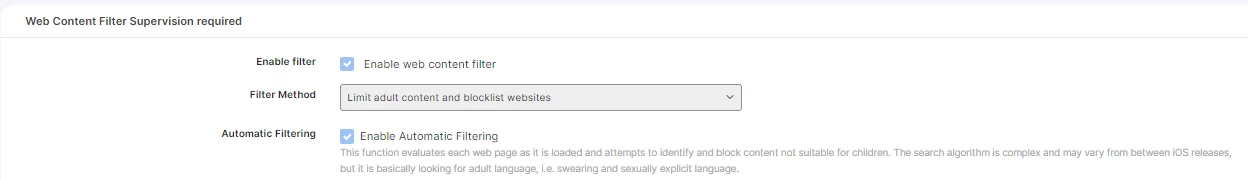 I noticed that "private navigation" is now accessible on Safari despite using a "web content filter" profile present on the devices. Deleting history is still impossible.